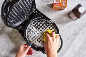 - After each usage, wipe off the waffle iron’s outside and remove any batter spillage.